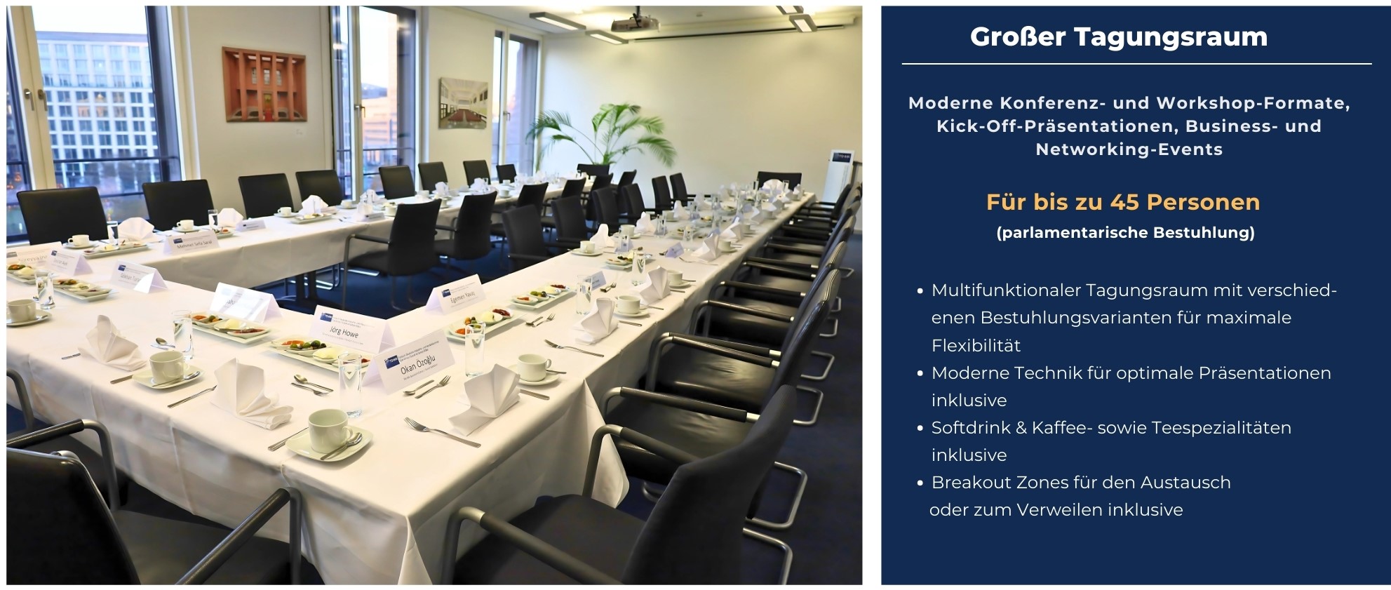 Suchen Sie einen repräsentativen Seminar- oder Tagungsraum im Herzen Berlins? Dann sind Sie bei uns genau richtig! Unsere modernen und stilvollen Räumlichkeiten bieten Ihnen die perfekte Umgebung für Workshops, Seminare, Schulungen oder geschäftliche Meetings – in einer Atmosphäre, die Produktivität und Kreativität fördert.